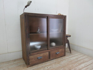 古い木味モールガラスの2杯引き出し収納棚G127 アンティーク家具陳列棚食器棚水屋箪笥店舗什器カフェ什器無垢材古家具