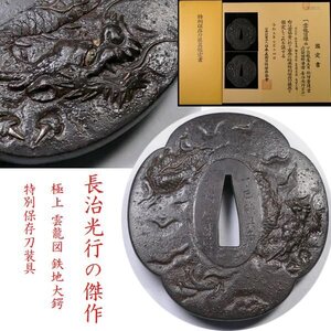 厳選金工特集② ◆特別保存刀装具◆「長治光行」が誇る最高傑作! 「極上 雲龍図」 鉄地大鍔 鉄味・細工共に最上級です 【安値出発】k424