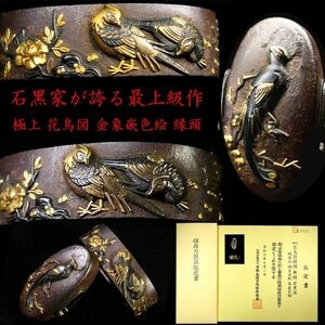 厳選金工特集③ 「石黒家」が誇る最上級作品! 出来見事!「極上 花鳥図」 ◆保存刀装具◆ 金象嵌色絵 鉄地縁頭【安値出発】k425