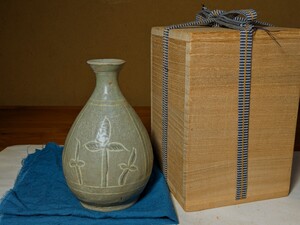 【哲】珍しい李朝三島白黒象嵌高麗人参葉文徳利(李朝初期)