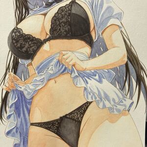 【原画】 【恥ずかしいけどあなたなら】手描きイラスト 水彩画 A4 オリジナルイラスト MM011 カラー ウェイトレス 黒髪 ロングヘア
